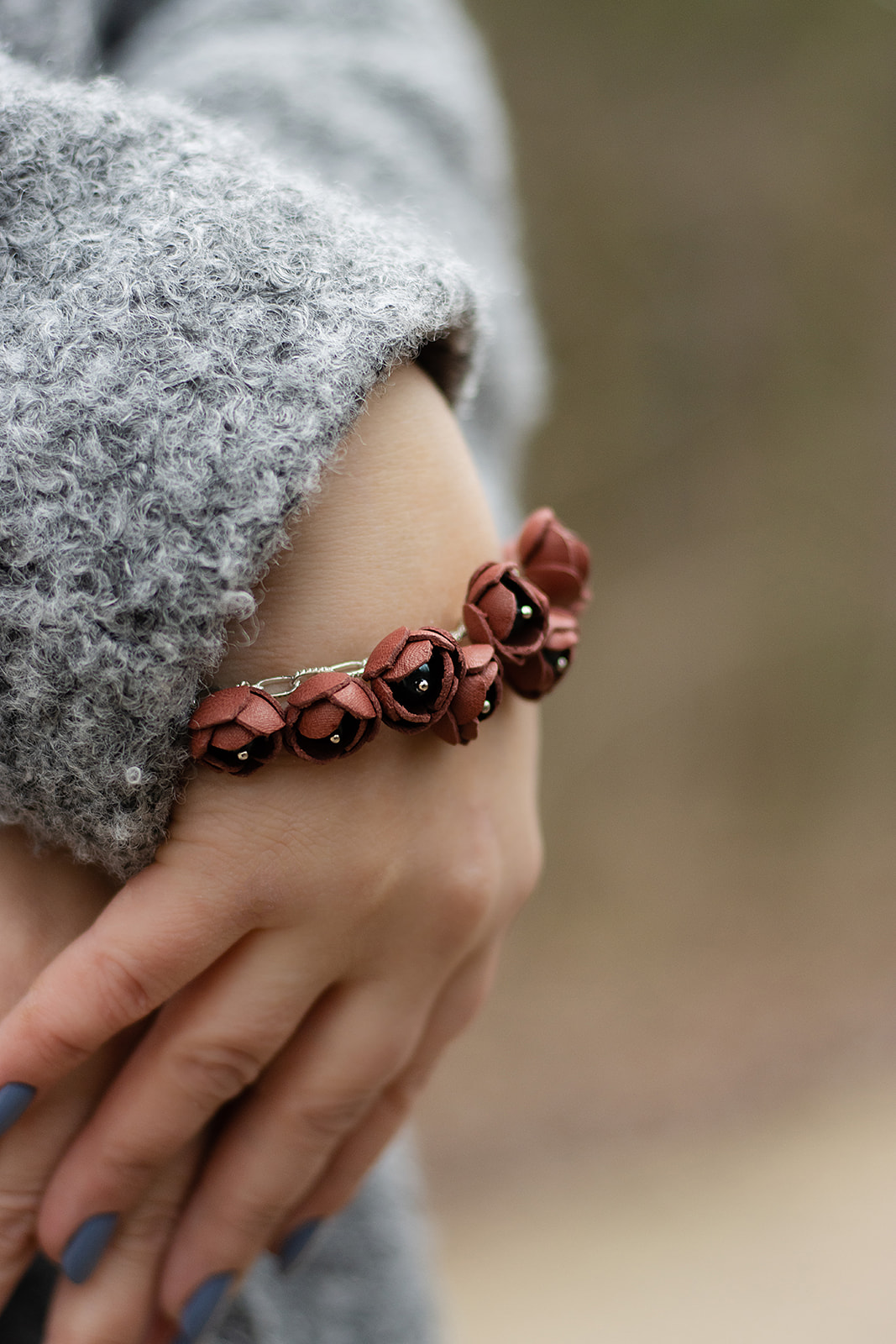Explore our Bordeaux bracelet with leather flowers, glass beads, pearls, lava stones, and silver-toned metal. A sophisticated, handmade accessory for all sizes.
