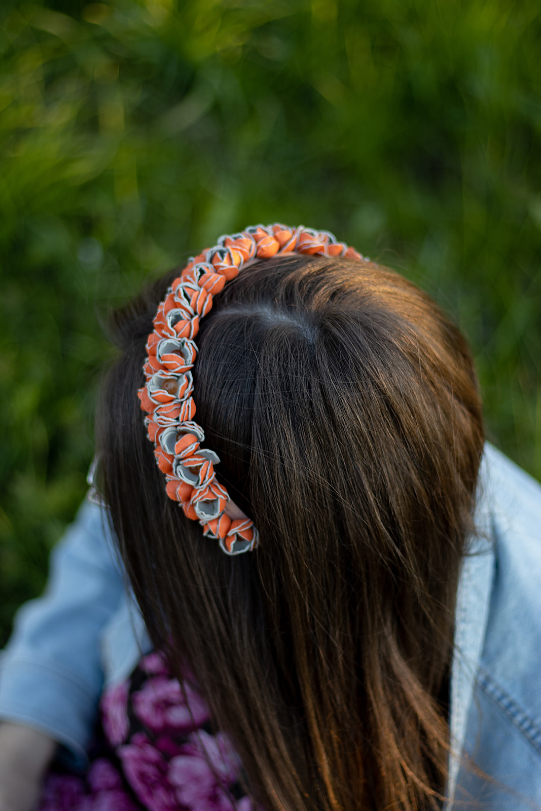 Enhance your style with our ginger headband, adorned with two rows of 100% leather flowers, complemented by glass beads, pearls, and lava beads. The addition of satin creates a sophisticated touch, making this headband a unique accessory. Designed in one size to fit all, it’s perfect for adding a statement to any outfit.
